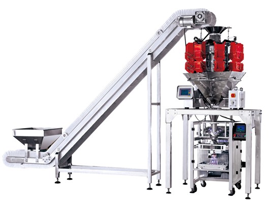 系统组成部分:L型上料机、8斗电脑组合秤、操作平台、自动包装机、上料机