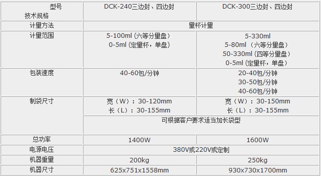 【DCK-240/300三边封、四边封颗粒自动包装机规格】