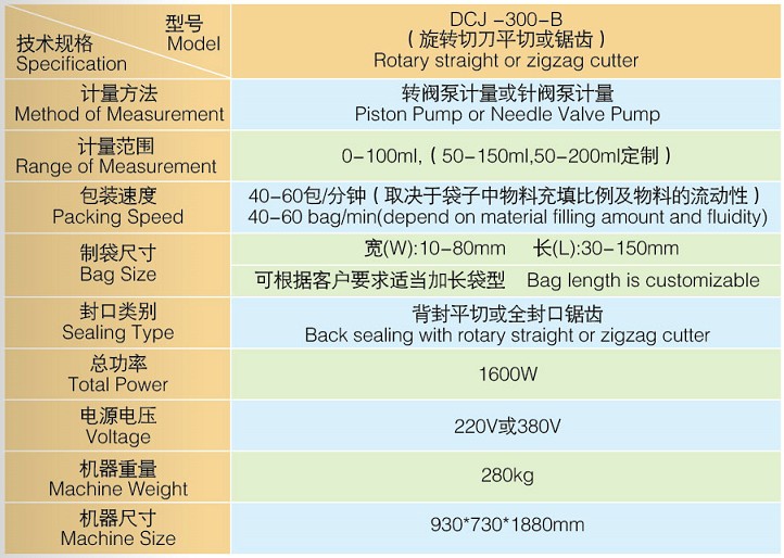 DCJ-300-B背封液体旋转切刀包装机技术规格: